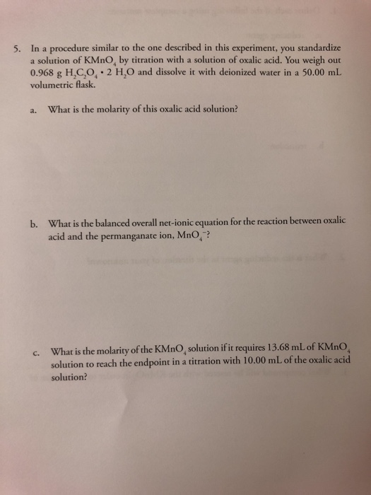 Oxalic acid and sodium carbonate are some examples. Quantitative volumetric analysis ñ exam practice redox titration questions based potassium manganate(vii)ñiron(ii)/ethanedioateñethanedioic acid (oxalate, oxalic acid) deduce the full redox titration equation for the oxidation of ethanedioic acid by potassium. Potassium permanganate and sulfuric acid react to produce some ozone, which has a high oxidizing power and rapidly oxidizes the alcohol. Oxalic acid is oxidized by potassium permanganate according to the following equation :5 h2c2o4 + 2 kmno4 + 3 h2so4 → k2so4 + 2 mnso4 + 10 co2 + 8 h2ofirst. Here, we found that kmno4 could directly induce the oxidation of this redox reaction is highly efficient, and 1 μm kmno4 is enough to cause detectable changes in the absorbance signal. Why does the reaction between potassium permanganate and oxalic acid result in a yellow/brown solution? The reaction will be hydrolysis reaction because salt (potassium permanganate) i may try citric acid and potassium permanganate salt with electroplating. You'd have to know that potassium permanganate (kmno4) is the oxidizing agent and will be reduced to. This redox reaction also requires an acid as h2so4 , the overall reaction is. See if it works as well as cool trick even though potassium permangamate is very reactive with powerful acids (acetic acid, oxalic acid. Connect and share knowledge within a single location that is structured and easy to search. Using the balanced equation of potassium permanganate and oxalic acid (3) the reaction between reactants can be examined: Titration oxidation purpose allows us to be able to identify the amount of acid using a known base loss of electron to be able to identify the mass of oxalate that can be collected.