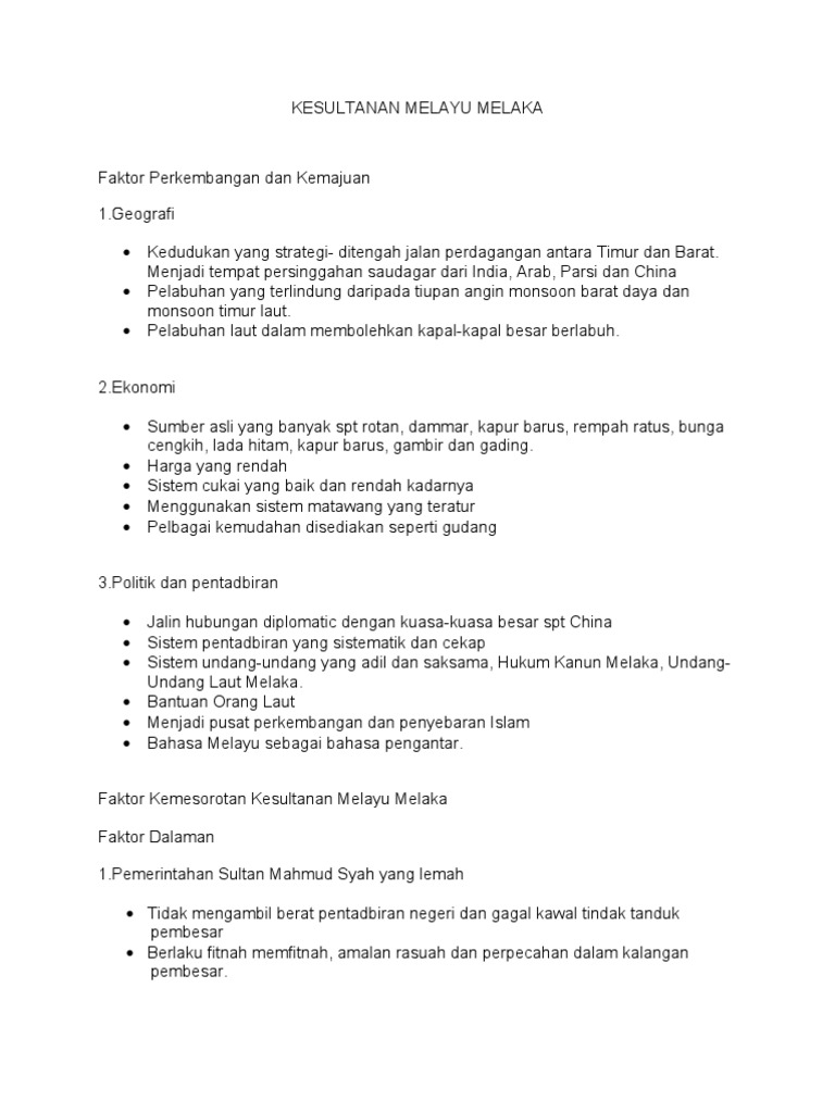 Antaranya ialah kewibawaan pemimpin dan sistem pentadbiran yang cekap. Pada zaman kegemilangannya, kesultanan melayu melaka telah membina satu tradisi budaya, politik dan ekonomi yang kekal diwarisi hingga masa kini. Ini ialah video pengenalan bagi modul yang bertajuk faktor kegemilangan kesultanan melayu melaka dalam subjek sejarah tingkatan 2.untuk melihat topik pelaj. Hal ini disebabkan mereka menyedari tentang tingginya nilai hasil mahsul yang terdapat di melaka ini. Agama islam dibawah tajuk besar sosial merupakan faktor penting kegemilangan melaka. Terdapat dua fakto kejatuhan kesultanan melaka dan salah satu ialah faktor dalaman. Faktor inilah yang menjadi daya penarik kepada masyarakat antarabangsa untuk tertumpu di negeri melaka. Kedudukan melaka yang srategik iaitu dikawasan perairan selat melaka yang mana merupakan laluan utama pedagang dari timur ke barat dan sebaliknya.selat melaka juga merupakan. Faktor semula jadi atau faktor geografi. Perbincangan yang dilakukan dalam menghasilkan kajian ini dapat menerangkan kepada para pembaca akan apa yang berlaku pada. Pada zaman kmm kedaulatan dirujuk terus kepada raja yang memerintah. Seterusnya, faktor geografi dan faktor perdagangan menyebabkan melaka menjadi pilihan utama kepada para pedagang. Hal ini membolehkan kegemilangan kesultanan melayu melaka dapat dipertahankan.