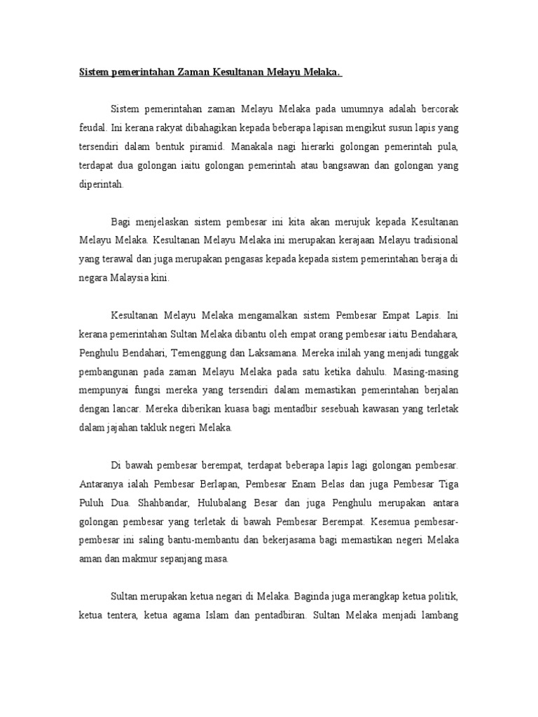 Bendahara merupakan penasihat utama sultan dalam pentadbiran. Kesultanan melayu melaka adalah sebuah kerajaan melayu yang terkenal dan termasyhur di asia tenggara. Kegemilangan kesultanan melayu melakatugasan individu. Selepas bendahara tun perak meninggal dunia, tempatnya diganti oleh bendahara tun mutahir. Agama islam dijadikan sebagai agama rasmi kesultanan melayu melaka oleh sultan muzaffar syah. Terdapat dua fakto kejatuhan kesultanan melaka dan salah satu ialah faktor dalaman. Selain itu, bendahara juga berperanan Kerajaan melayu melaka monday, 31 august 2015. Faktor tersebut memberi kesan yang mendalam sehingga penjajahan eropah yang membawa kebinasaan dan kehancuran melaka. Pertukaran pendapat ttg hukum agama 3. Pada awalnya melaka bukanlah sebuah kerajaan islam. Setiap pembesar diberikan tugas dan tanggungjawab untuk melicinkan pentadbiran. Seterusnya, faktor geografi dan faktor perdagangan menyebabkan melaka menjadi pilihan utama kepada para pedagang.